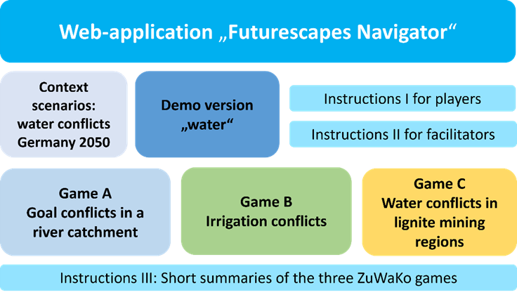- Short summaries of the three ZuWaKo games: A: “Goal conflicts in a river basin” , B: “Conflicts over irrigation” , and C: “Water conflicts in lignite mining regions”: Instructions_three_water_games (in German)