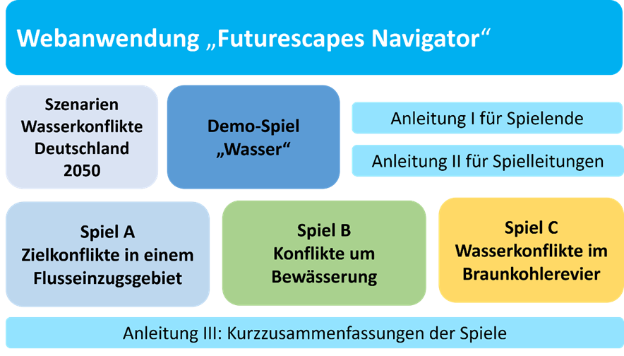 Die im Projekt entwickelte Webanwendung Futurescapes Navigator sowie die dazugehörigen Materialien stehen nach einer kurzen Registrierung kostenlos zur Verfügung. Das Angebot umfasst die in den drei Modulen entwickelten Planspiele, eine vereinfachtes Demo-Version und verschiedene Szenarien zu Wasserkonflikten in Deutschland im Jahr 2050. Alle Materialien können frei genutzt und an eigene Bedürfnisse angepasst werden. Beim Futurescapes Navigator handelt es sich um eine Werkstattversion, die in zukünftiger Forschung weiterentwickelt und verbessert wird.